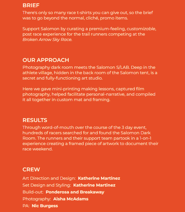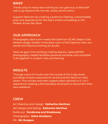 I have worked with Rhoam Creative to lead athletes and visitors through an interactive experience at the Broken Arrow Sky Race at Palisades in Tahoe, California. This was done to showcase the new Salomon Pulsar 4 shoe, which was broken down and shown to emphasize how their new design answers the issue that carbon plating cannot for trail running. Their shoe out-performs the standard carbon plating done for road racing.