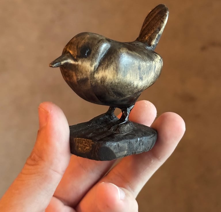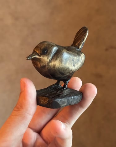 This is a soft-wood whittled Carolina Wren with wood that I brought from Alaska.